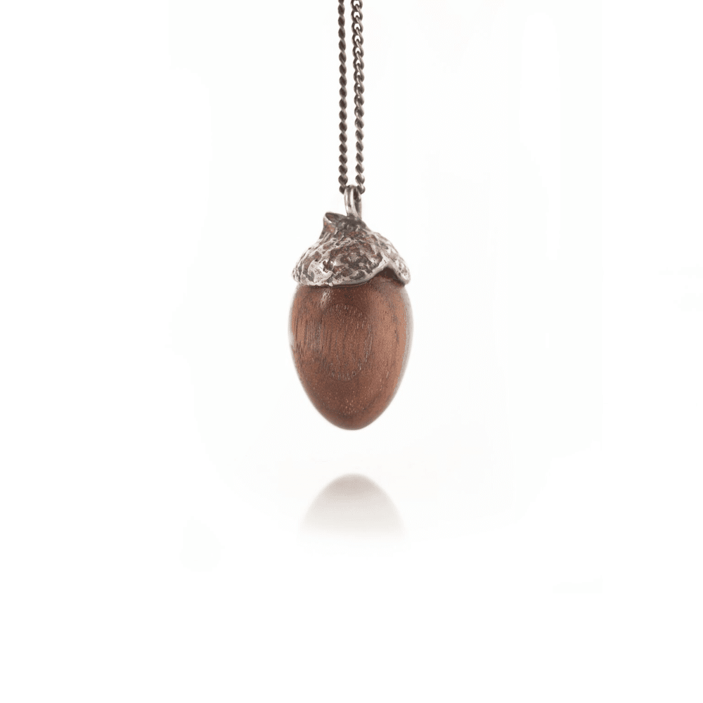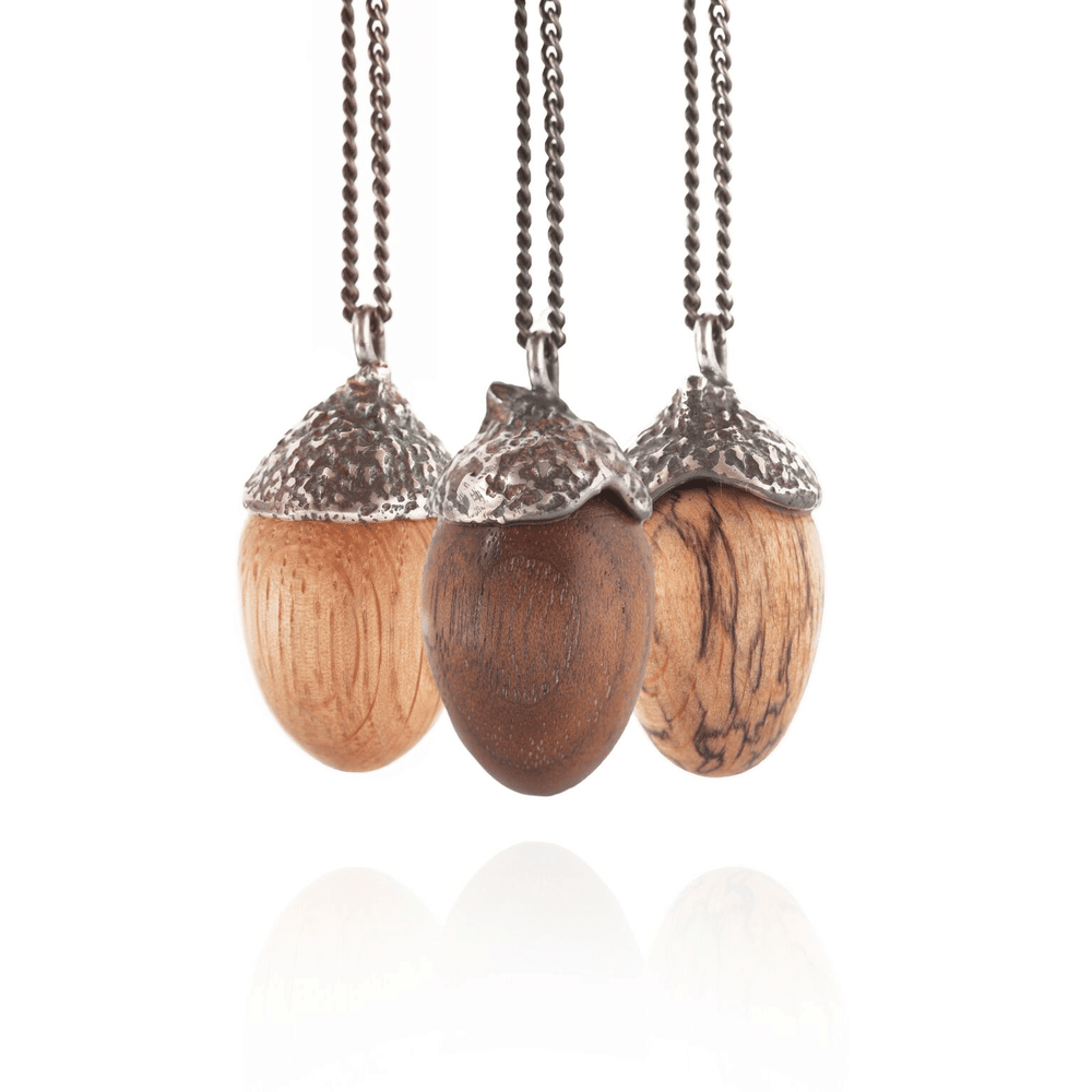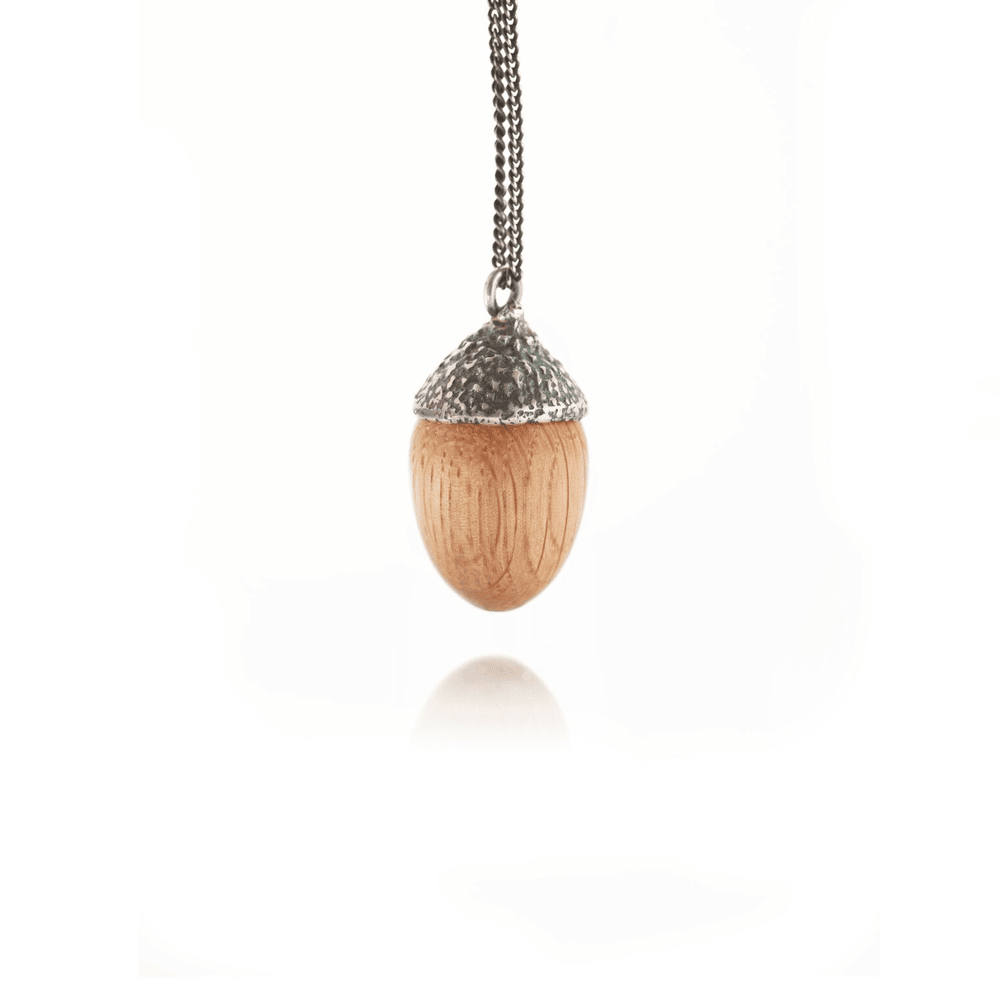 Agern halskæden er er en kombination af sølv og træ. Agernet er hånddrejet i forskellige træsorter og sølvdelen er støbt af årstidens agern. Man kan bestille agernet i amerikansk ahorn, eg og ahorn. Hvert smykkeagern fremstår unikt. Der findes armbånd og øresmykker til dette efterårs smykke.